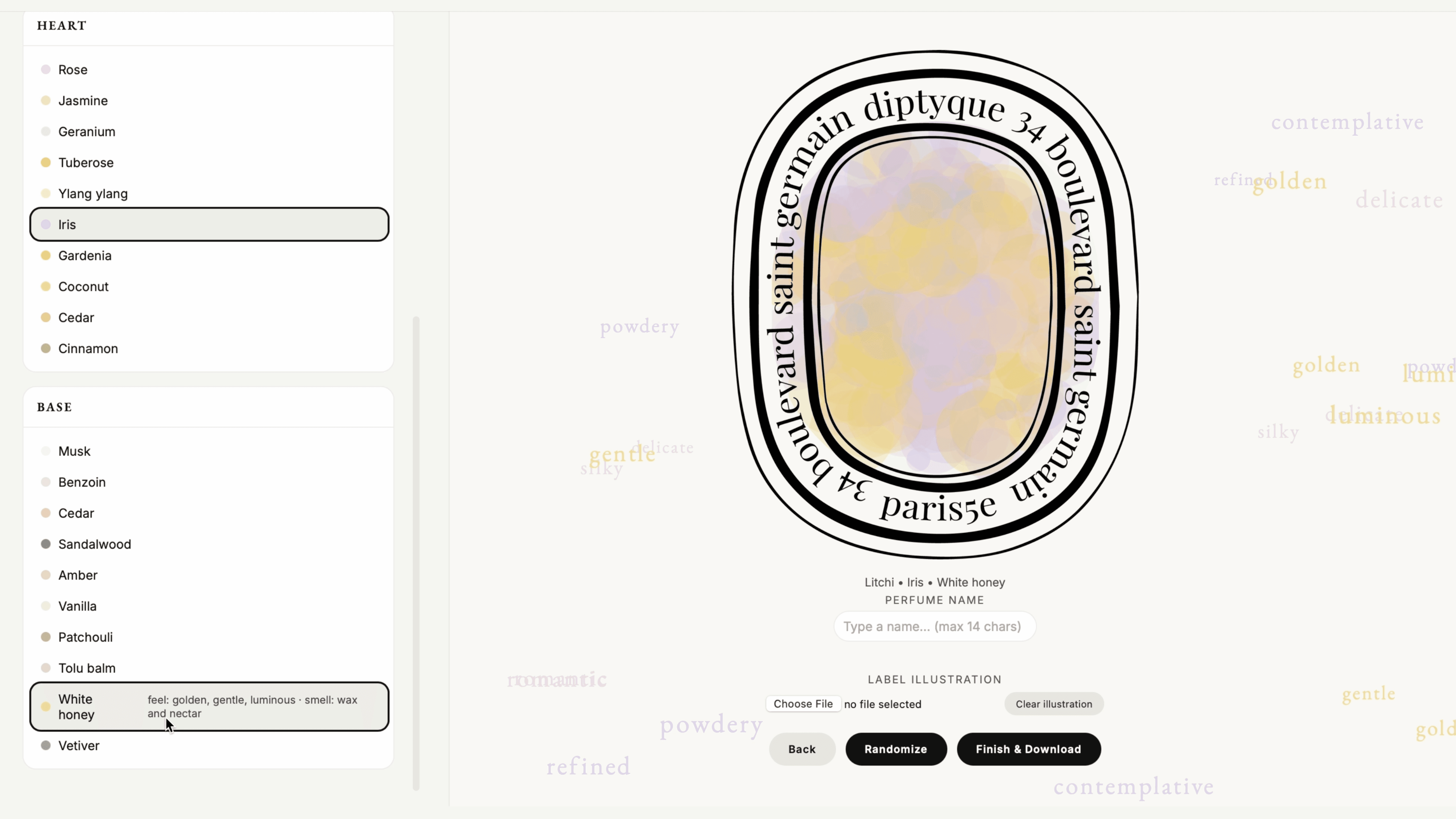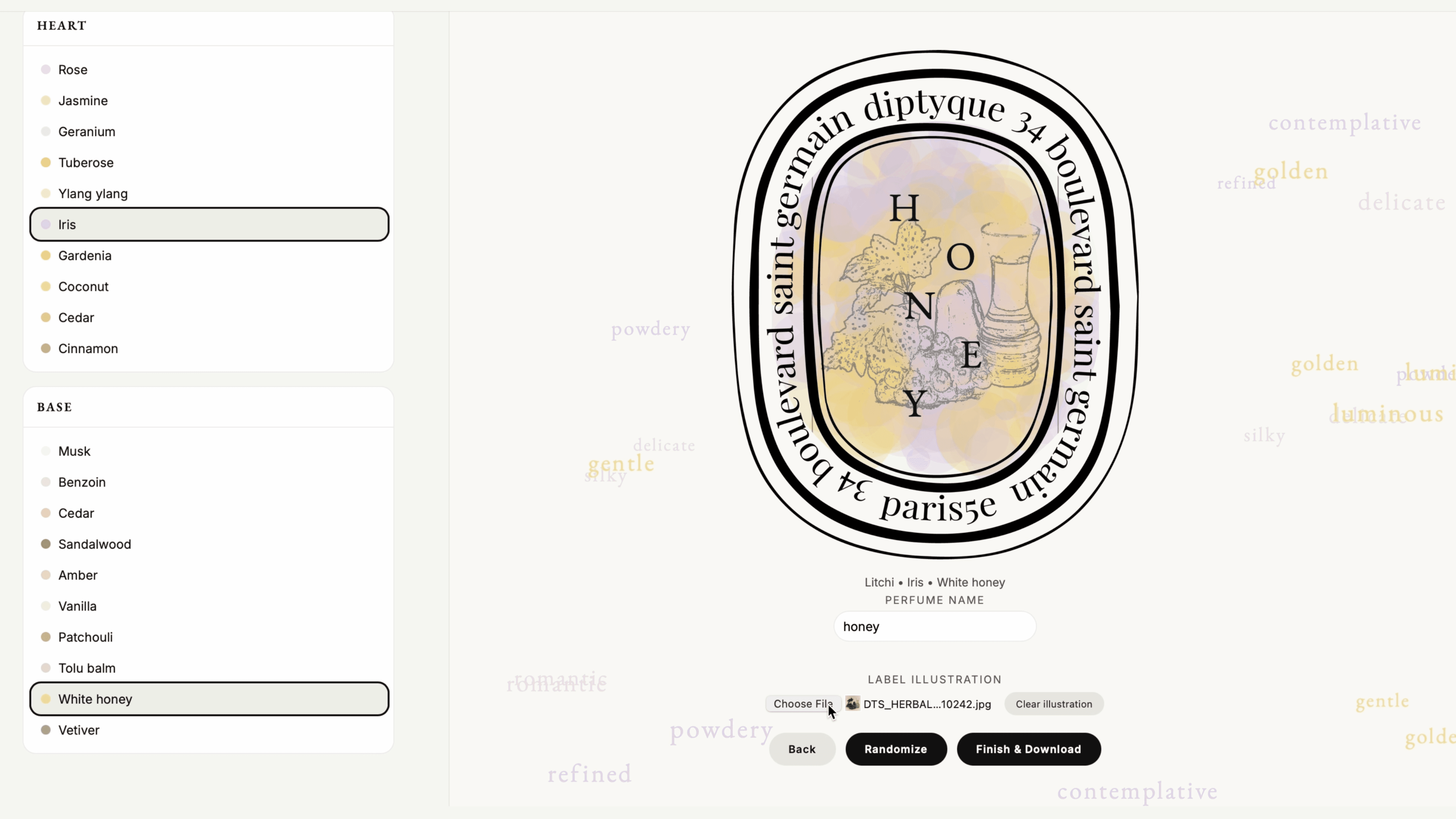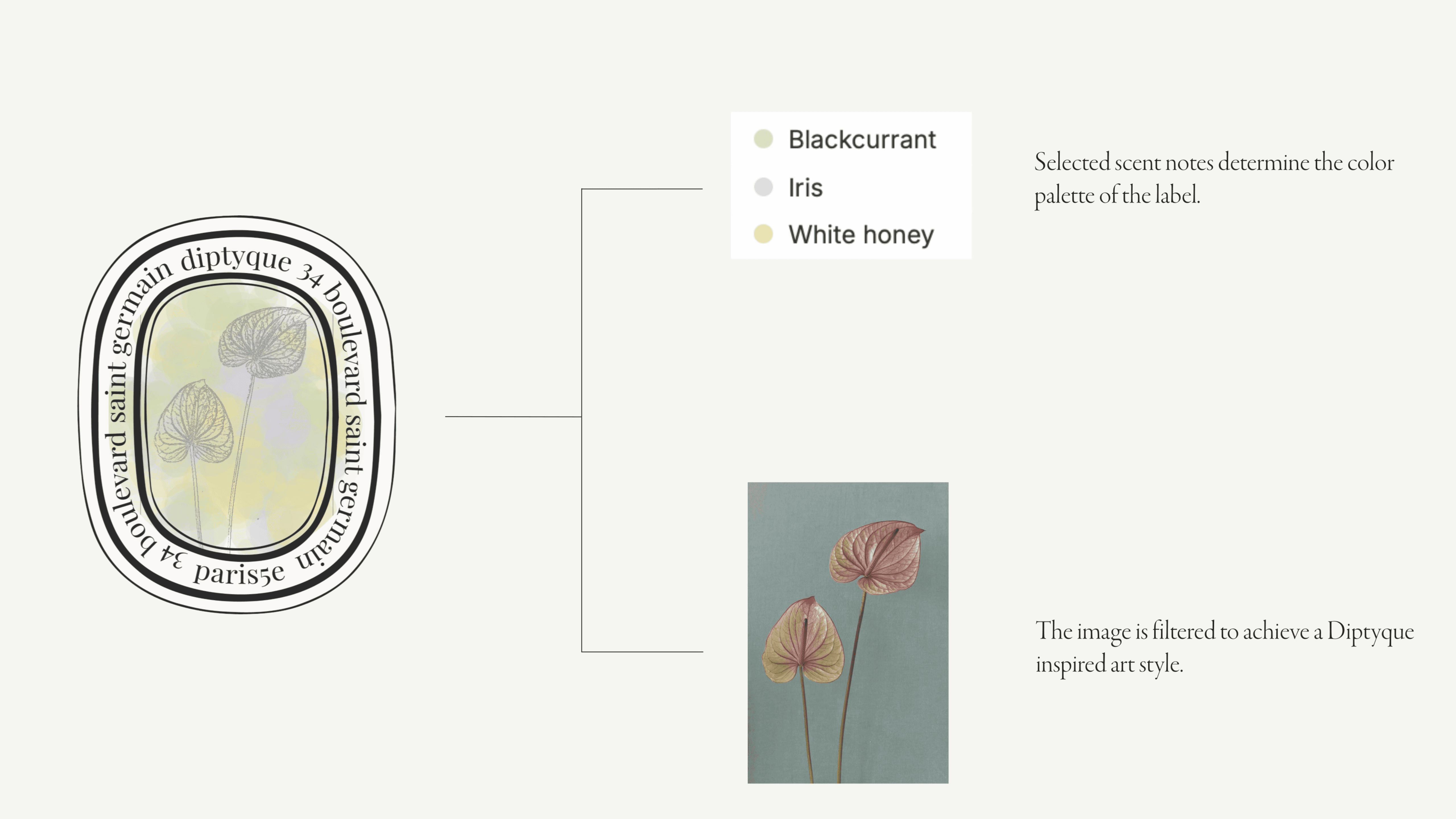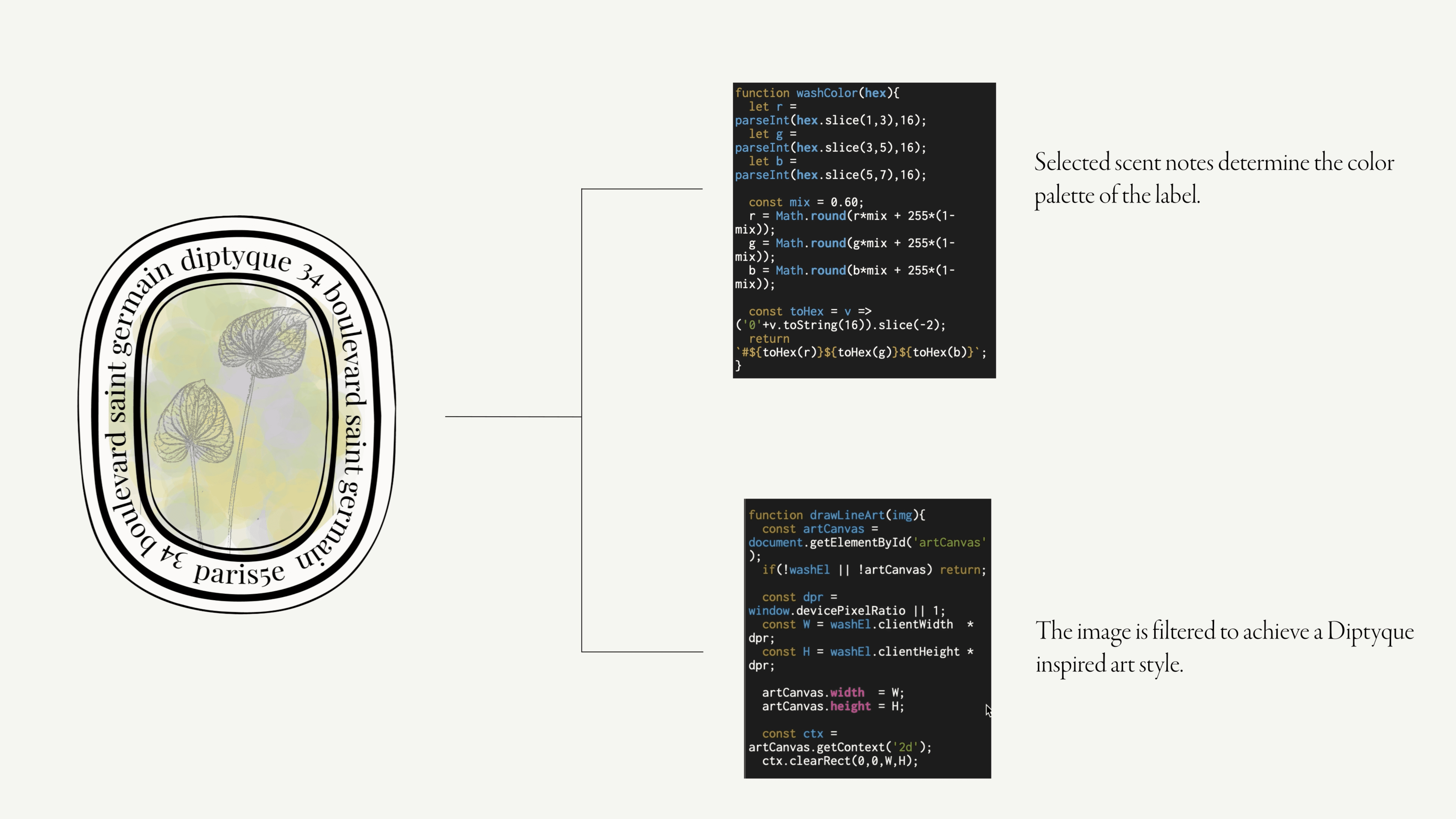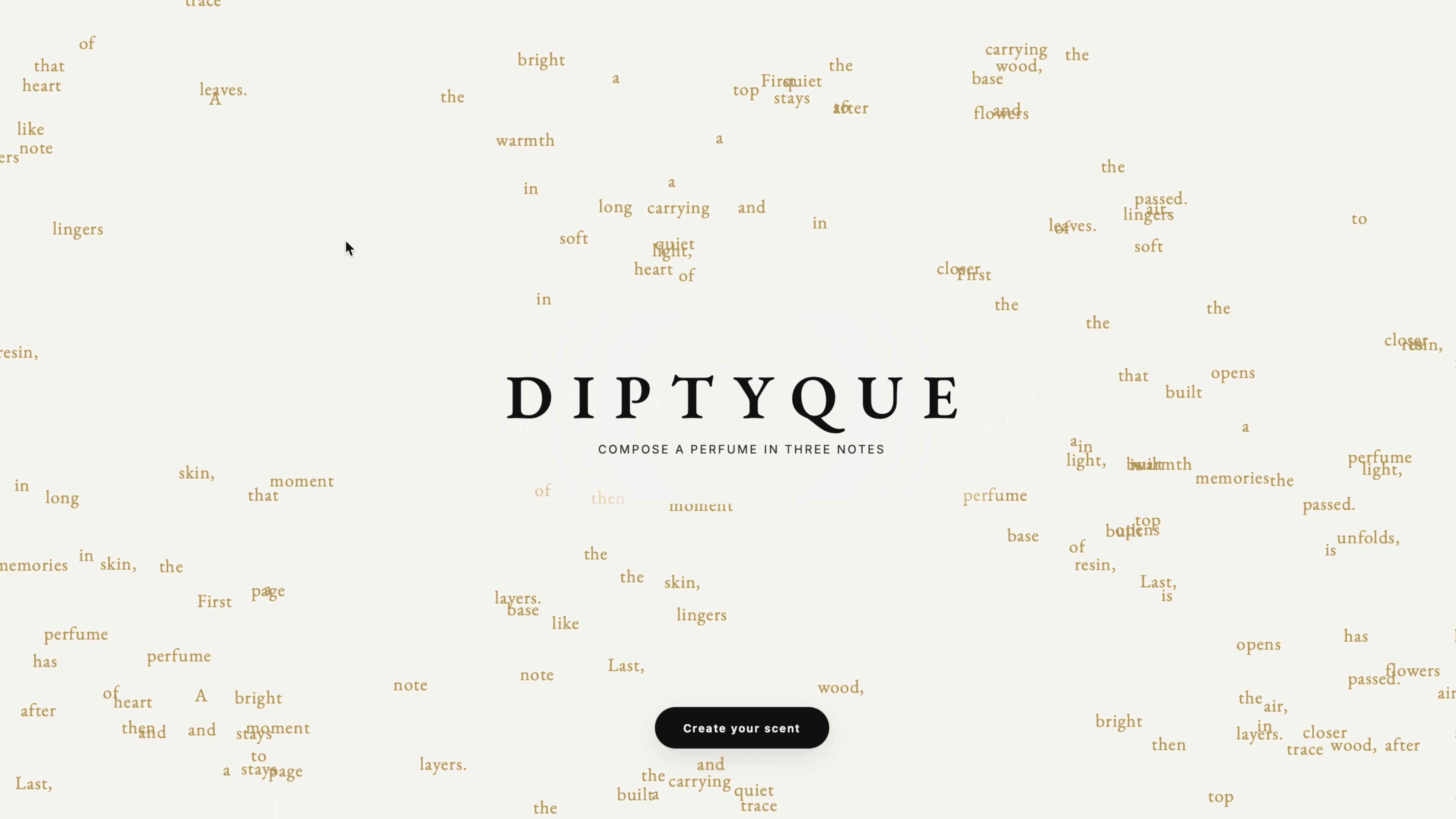 Diptyque Scent Lab lets users create a fragrance using Diptyque's three note structure in an inerative website. Using an interactive p5.js system, each note becomes color and moving circular graphics in the brand's style. As users blend their notes, a digital scent profile and personalized packaging design appear, showing how fragrance can become a visual generative system.