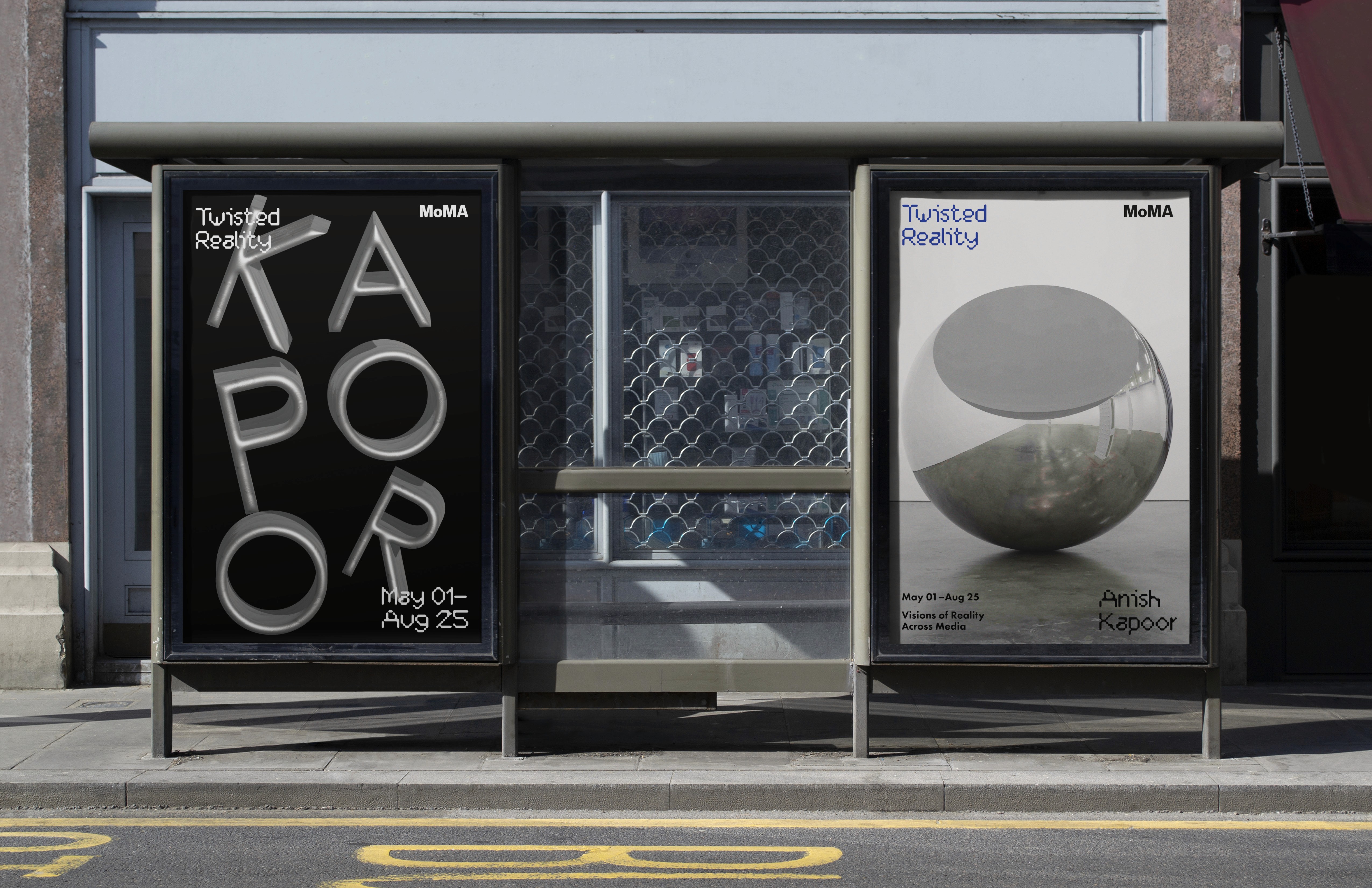 The installation design suggests a space that the audience can interact with at the exhibition. The cut up square symbolizes reality being split and walked through. On the surface the artists' works being projected with the title circling through. The cut up surface creates a texture where the text starts to get slightly twisted and distorted.